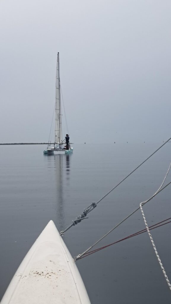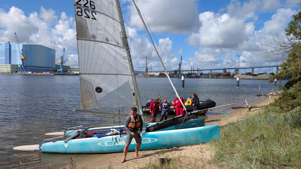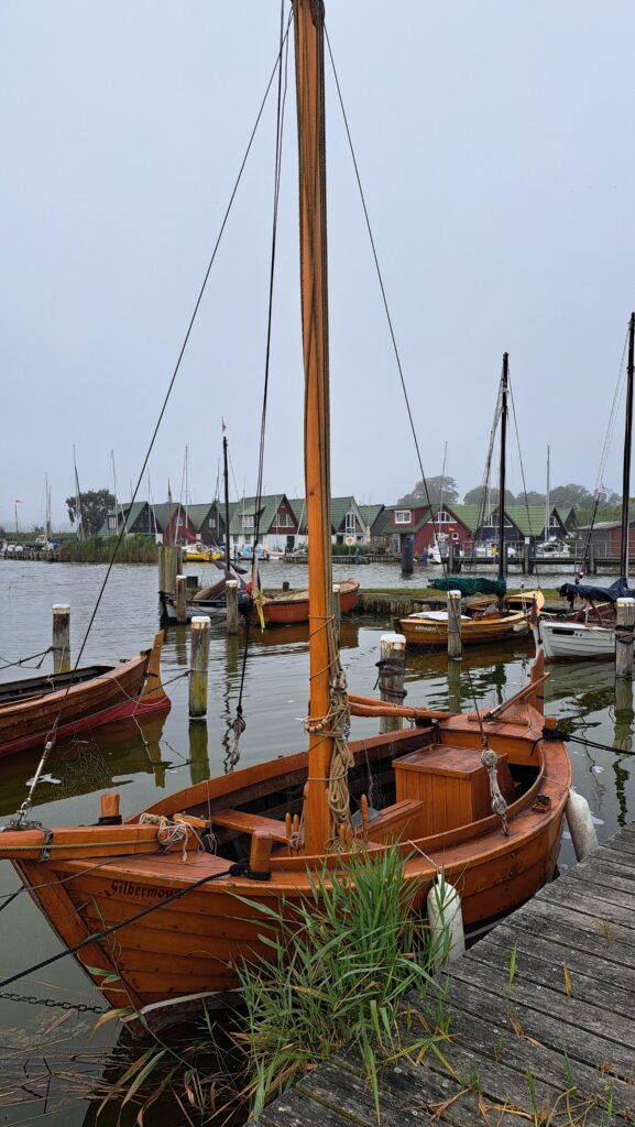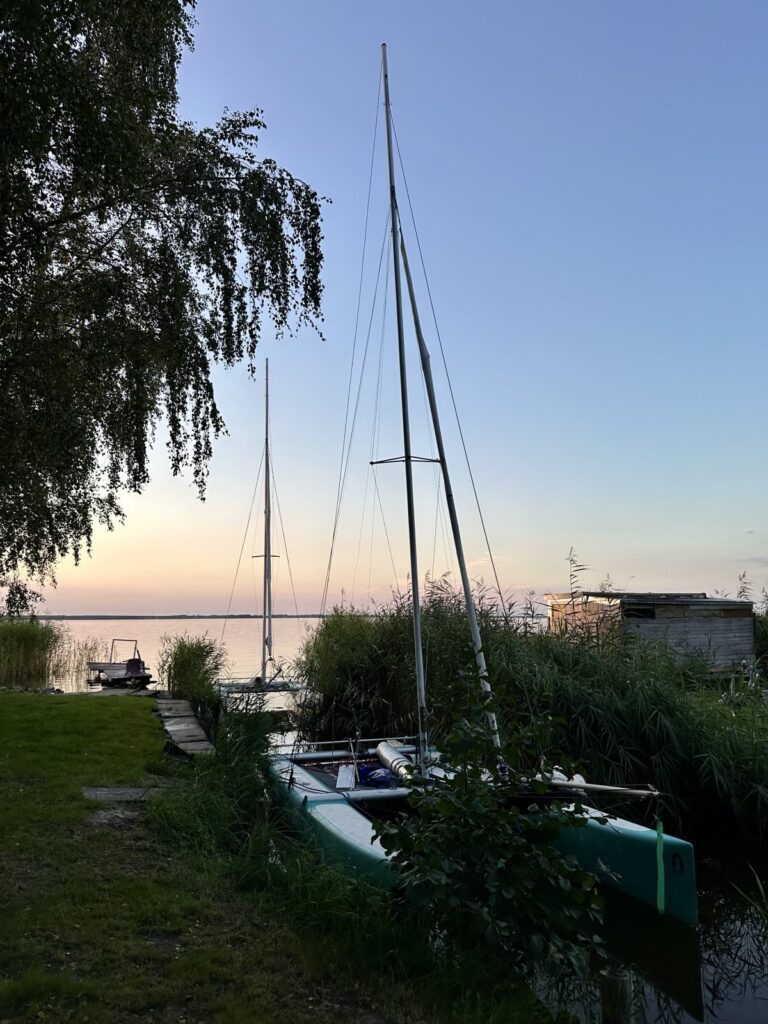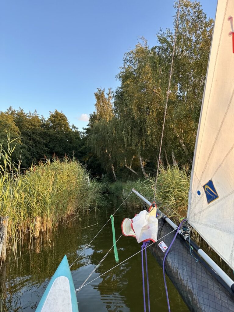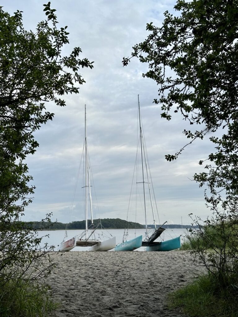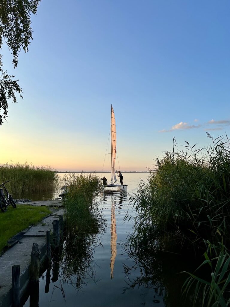 Samstag – und wie das so im Urlaub ist, keiner will der Erste beim Aufstehen sein … also erstmal ausschlafen und dann gemütlich frühstücken! Aber irgendwann schaffen wir es dann doch mal die Masten zu stellen. Danach Lager abbrechen, alles verstauen und „zack“ – gegen 14:00 Uhr schwimmen das „lekkerste bootje van’t strand“ und „Minty“ in den Fluten des Saaler Boddens. Bei schwachen Winden segeln wir über den Bodden und passieren als erstes Highlight die Bülten. Eine Reihe kleiner Schilfinseln die den Eindruck unberührter Natur vermitteln. Und weiter geht es bis wir in den „Hafen“ des Zeltplatzes von Bodstedt einlaufen. „Hafen“ ist hier ein großes Wort, denn das kleine Becken ist mit den bereits dort liegenden 9 Booten voll und so müssen unsere beiden Kats in der Hafeneinfahrt festmachen und die Nacht im Wasser verbringen.