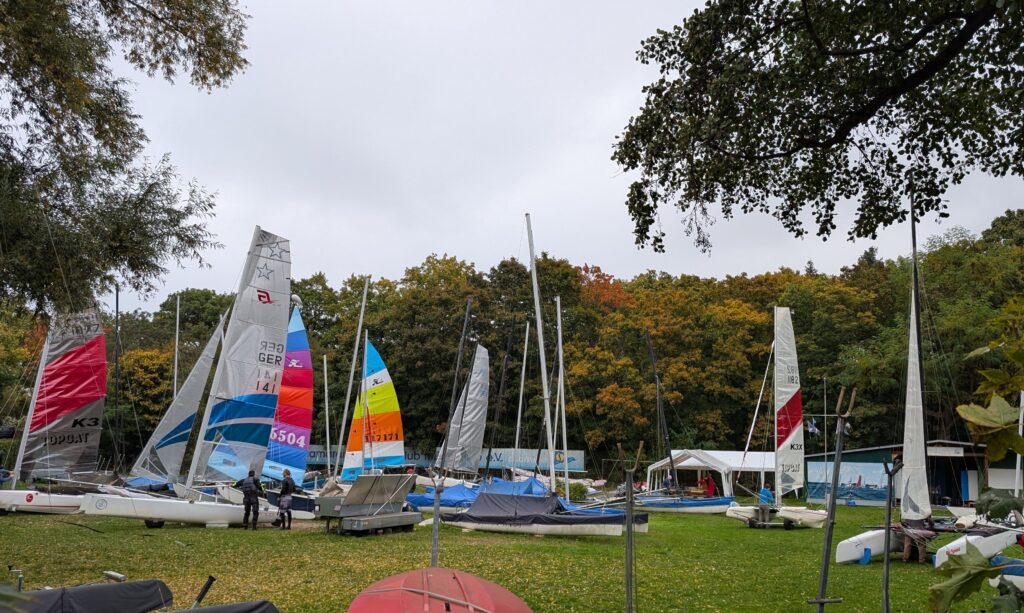 Das Wetter war ja nicht so richtig „muckelig“ – Nieselregen, 12°C, dichte Wolkendecke – dazu ein beständiger Wind aus West. Aber heute ist die letzte Möglichkeit um die Ergebnisse der Vereinsmeisterschaft nochmal zu „korrigieren“. Also – „hilft ja nix!“ – rein in den Neo und ab um die Tonnen. Pünktlich um 13:00 kommt das Ankündigungssignal. Die Uhr läuft runter und die Spannung steigt. Enno kann es gar nicht mehr aushalten und zieht als Erster an, leider wird sein Heldenmut nicht belohnt – Frühstart! Er muss zurück während der Rest des Feldes losstürmt. In engen Zweikämpfen geht es hoch zu Tonne 1. Als erstes gehen dort die Gennacker der schnellen F18 hoch. Dahinter dicht gedrängt das Pulk der Hobie 16 & K3. Heute hat hier keiner etwas zu verschenken. Sascha verliert sogar die Übersicht und lässt die Leetonne aus (leider ein RET im ersten Lauf). Enno hingegen kämpft und rollt das Feld noch von hinten auf. An der Spitze kämpfen derweil GER-6 und GER-352 um die Führung. Mit gutem Speed und cleverer Taktik haben Birgit & Frank die Führung von Alex & Felix zurück erobert, aber auf der zweiten Kreuz vernachlässigen sie die Deckung und so können die Jungs abermals durchrutschen und dann ihre Führung bis ins Ziel verteidigen – ein schöner Zweikampf! dahinter klafft dann eine kleine Lücke bis das Pulk der etwas langsameren Boote sich der Ziellinie nähert. Aber auch hier wird hart gekämpft! Es geht um Sekunden, denn bedingt durch das Yardsticksystem gibt es hier ja auch Fernduelle und so schrumpft ein vermeintlich bequemer Vorsprung von 1,5 min schnell zu Sekunden. Enno (K3) wird hier am Ende dritter, knapp vor Sophia & Nina (HC16). Gerade mal 5 Sekunden trennen die beiden Boote am Ende nach berechneter Zeit.